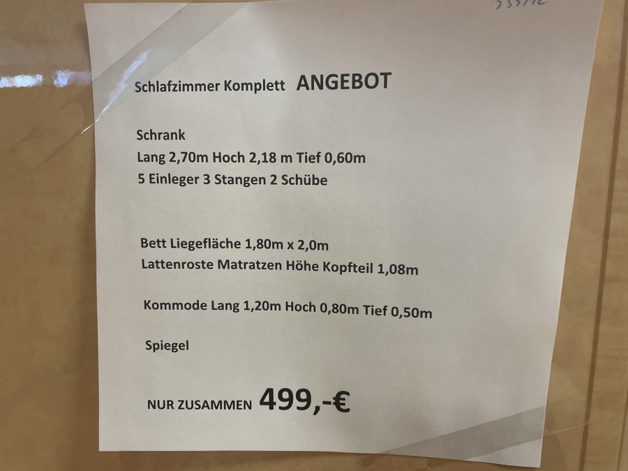Schlafzimmer Komplett Schrank 2,0m breit 2,20m hoch 0,60m tief 4 Einleger 2 Stangen Bettanlage Liegefläche 1,80m breit 1,90m lang Gesamt Tiefe 2,25m gesamt Breite 2,90m mit Lattenrosten gesamt Nur 399€